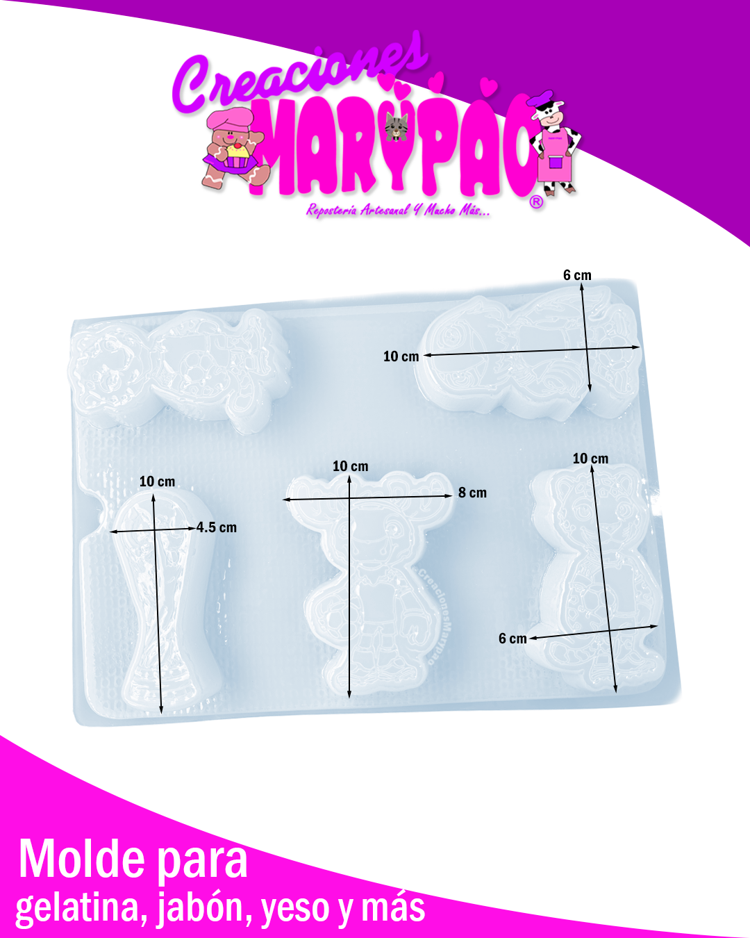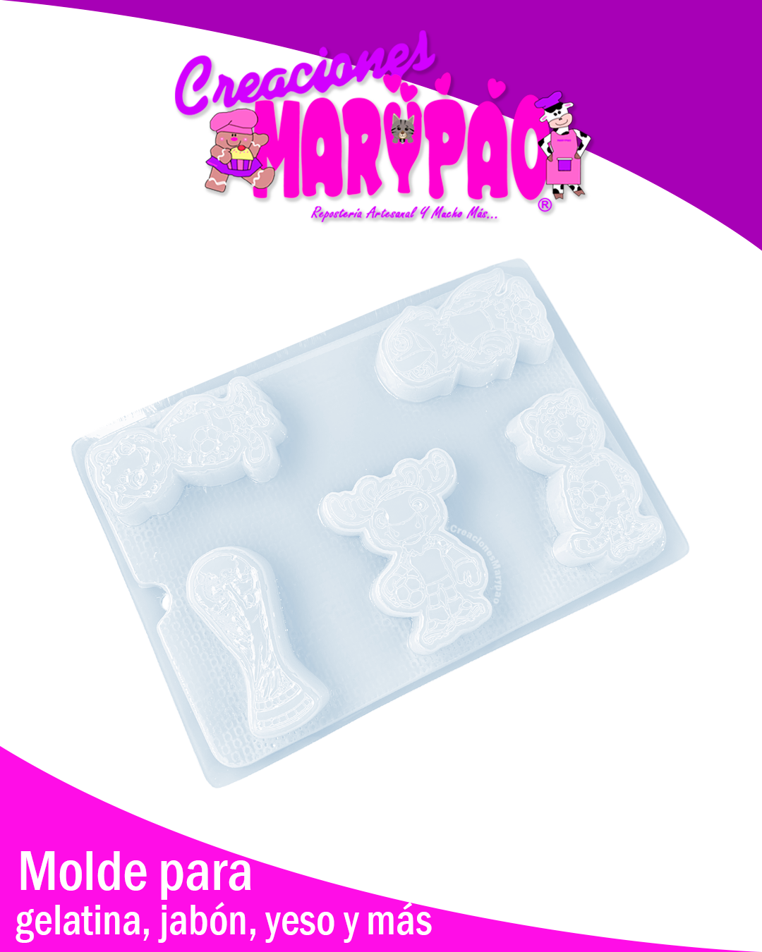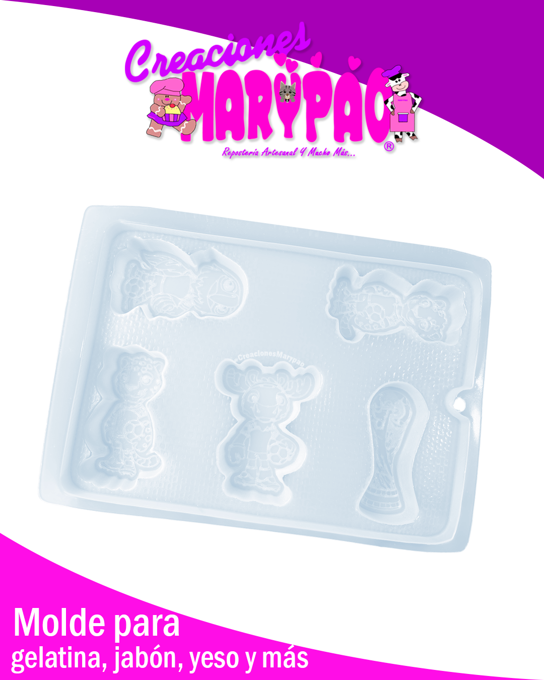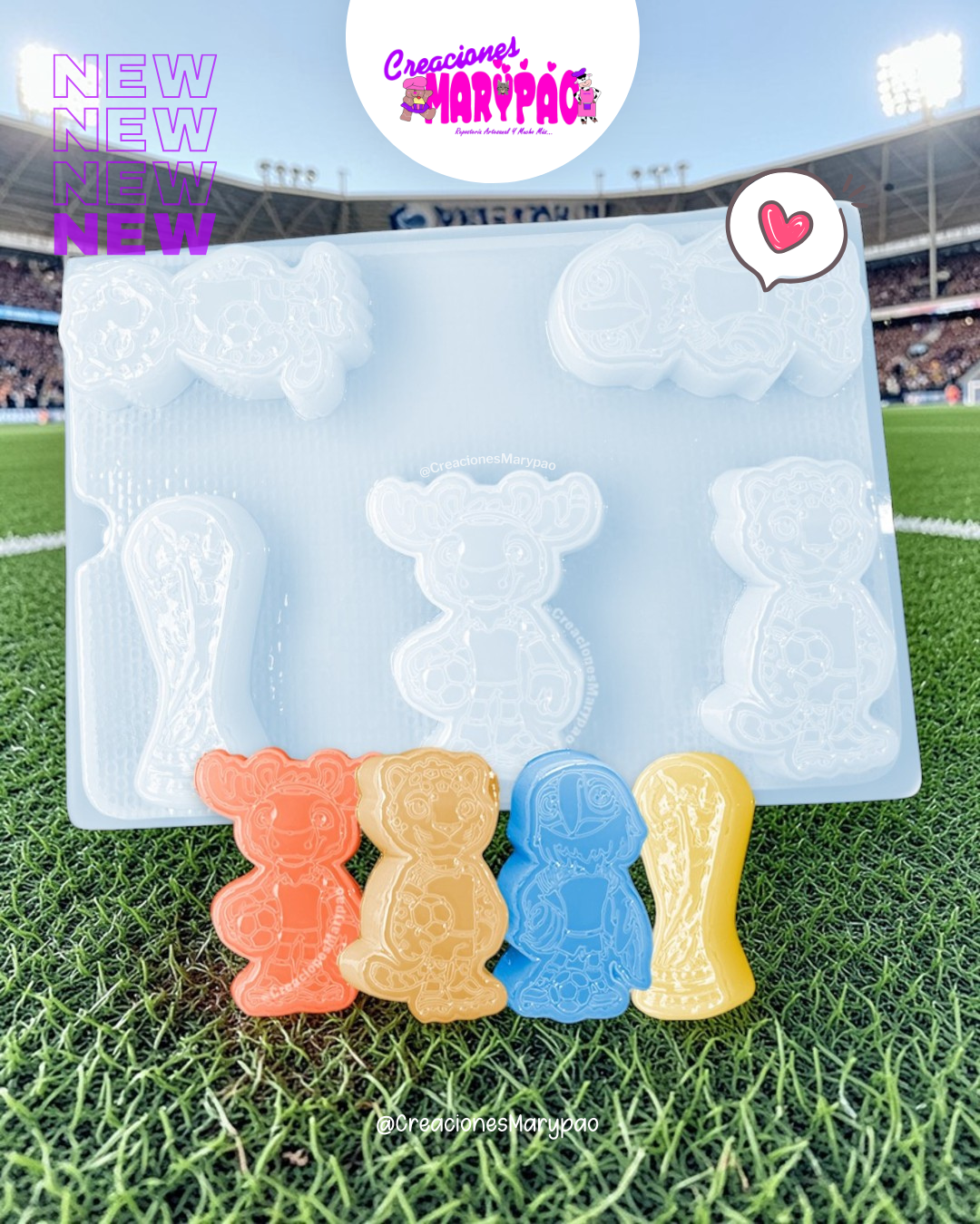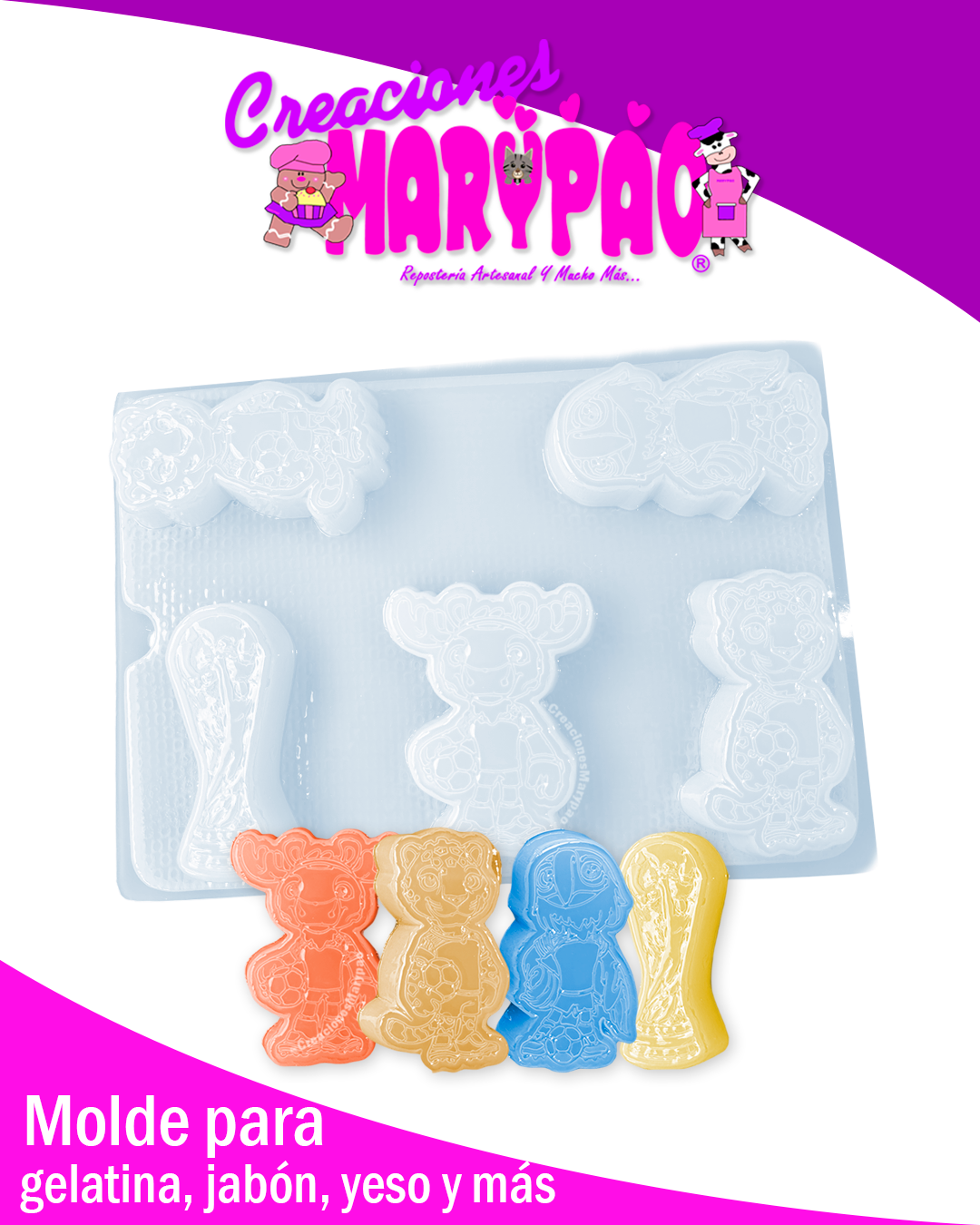Si eres fan del fútbol o buscas un diseño que siempre llama la atención, este molde es perfecto para tus creaciones. Incluye las adorables mascotas del mundial y la icónica copa, ideales para crear piezas temáticas que encantan a chicos y grandes.