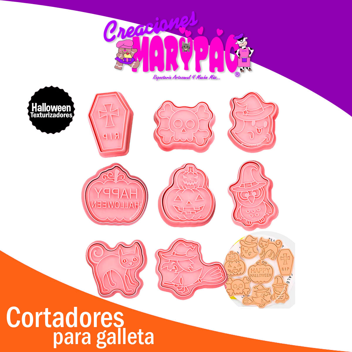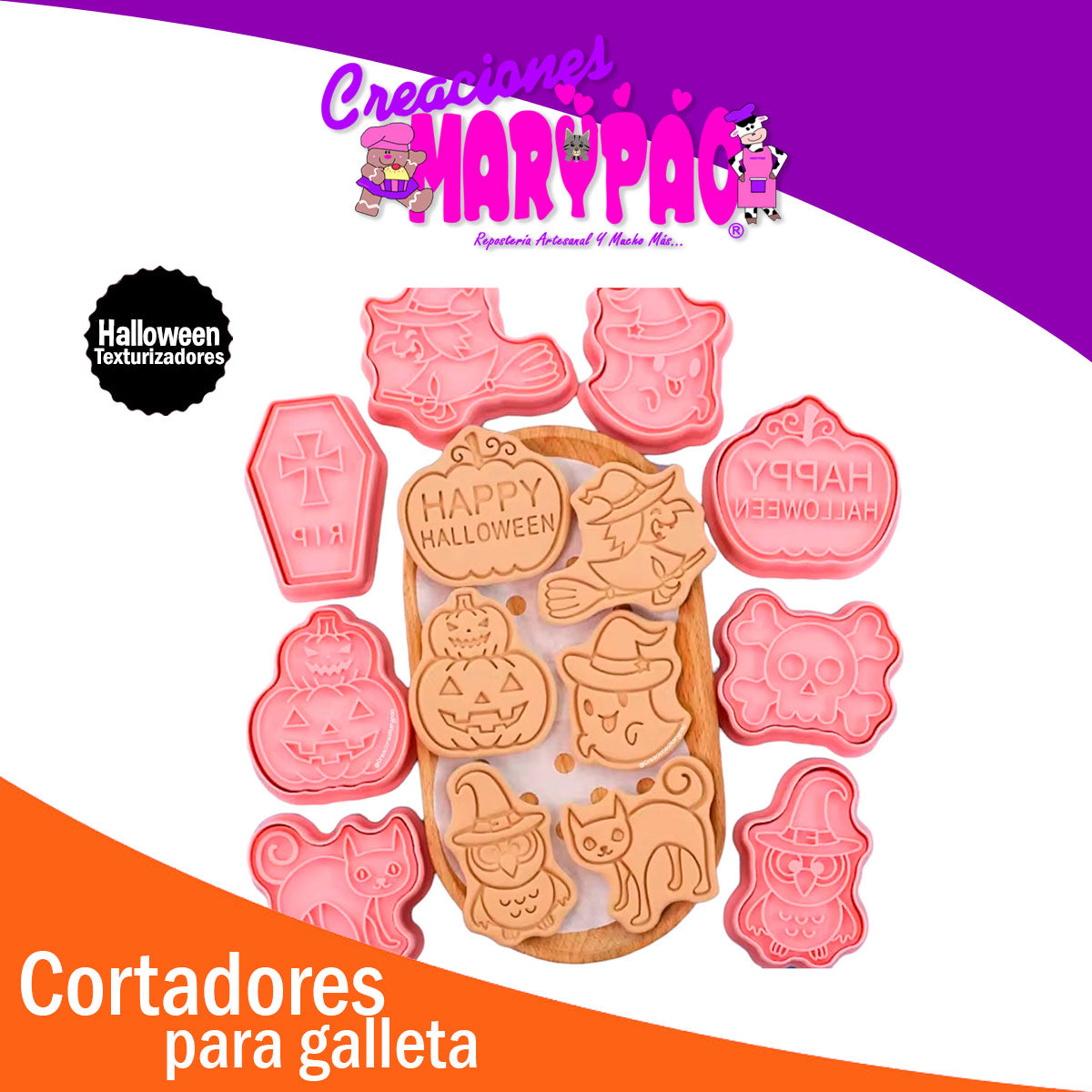 Este set de 8 cortadores texturizadores de Halloween es perfecto para dar vida a tus galletas con detalles escalofriantes. Incluye formas icónicas como un búho misterioso, un fantasma aterrador, un gato negro, una calavera espeluznante, dos modelos de calabaza, una lápida y una bruja volando. Cada pieza está diseñada para que tus creaciones tengan texturas y formas nítidas que asombrarán a todos en tus fiestas de Halloween. Ideal para decoradores de todos los niveles, ¡haz que tus galletas sean las protagonistas de la noche! 🍪🕸️