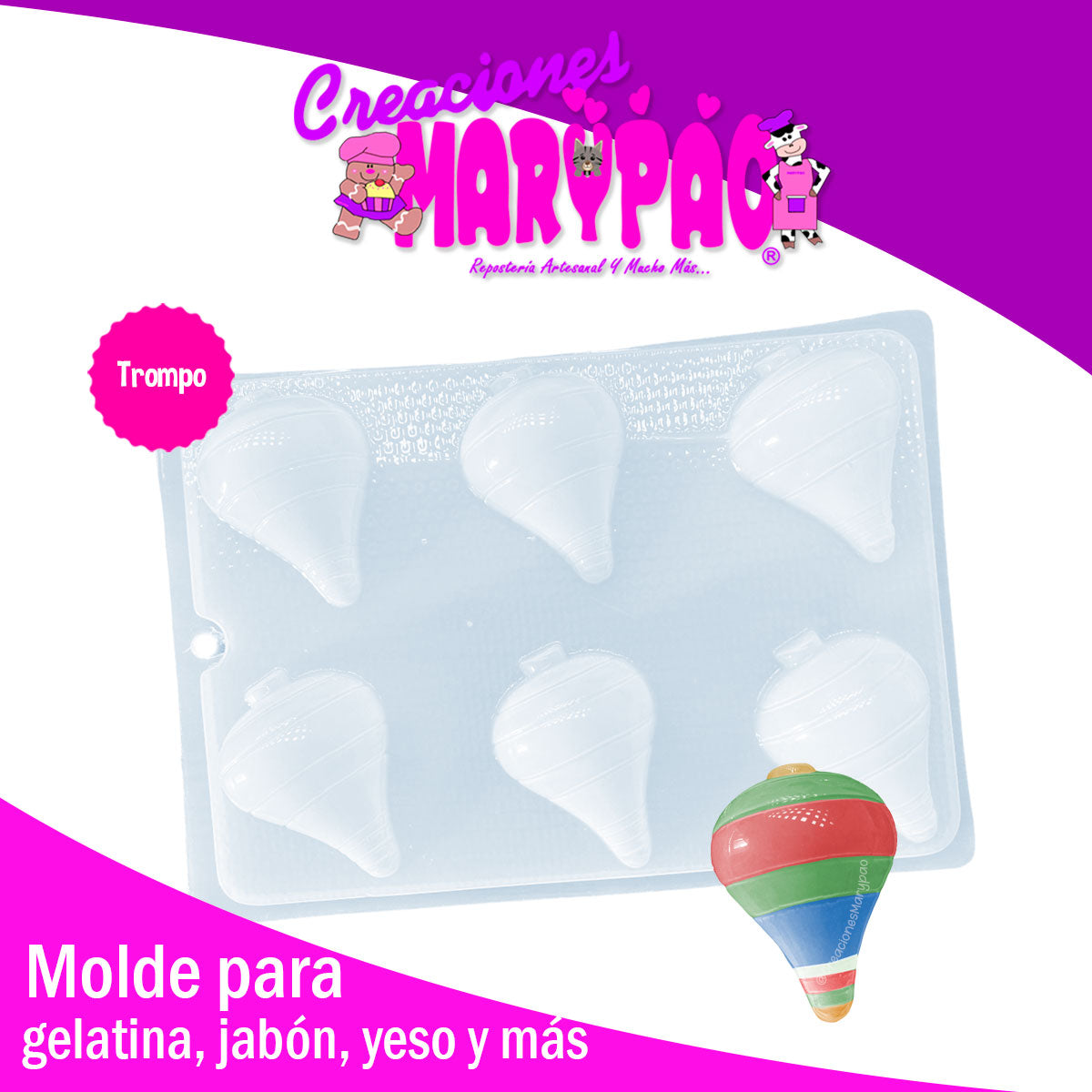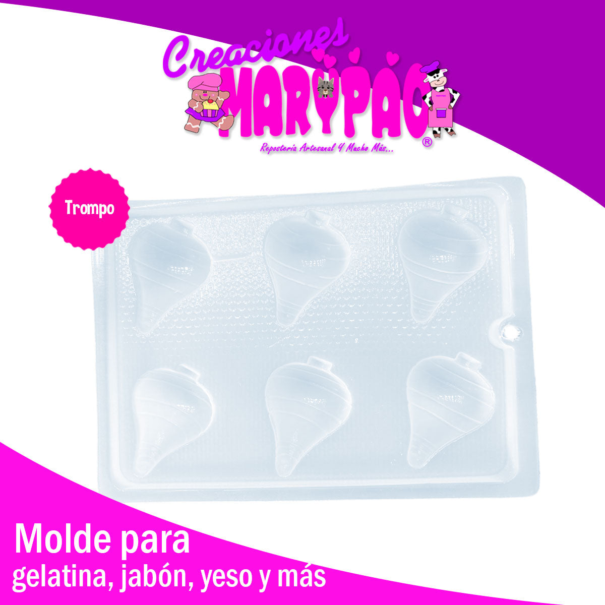 Este molde Trompo de la marca Creaciones Marypao es perfecto para crear gelatinas, figuras de yeso y jabones de forma divertida y original. Con su diseño en forma de trompo, podrás sorprender a tus invitados en fiestas patrias u otras celebraciones. El material de plástico garantiza su durabilidad y resistencia, ideal para un uso repetido. Además, cuenta con 6 ranuras para que puedas hacer varias figuras a la vez.